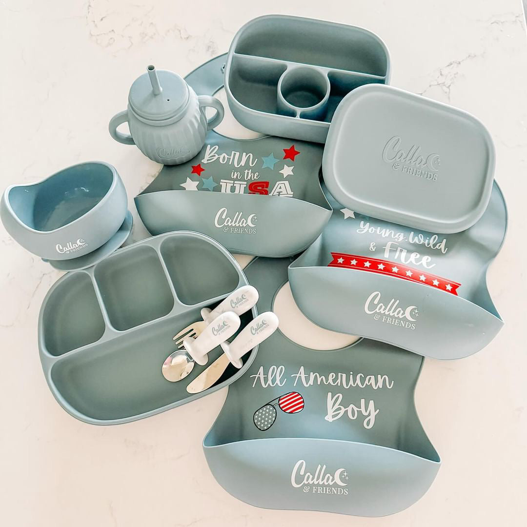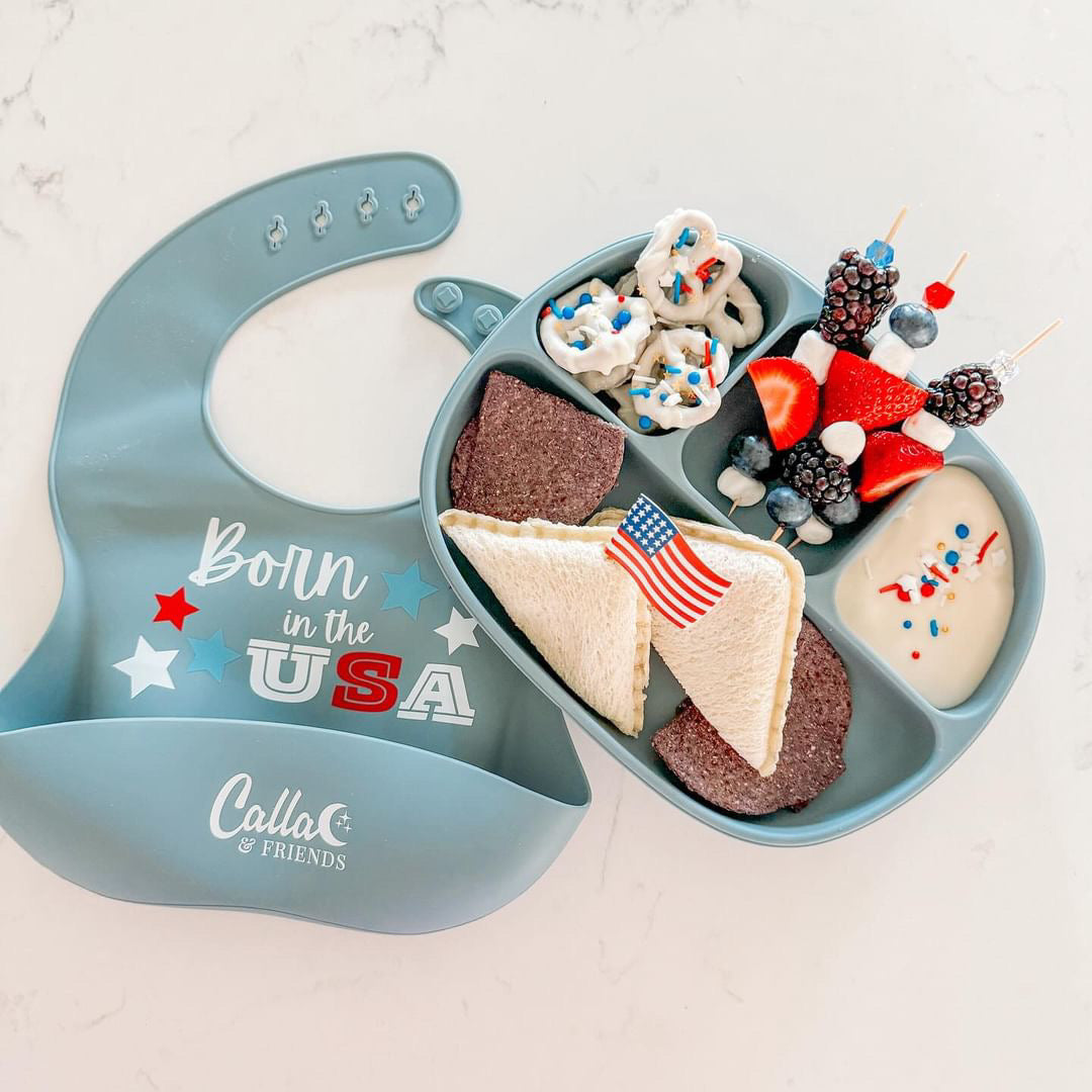 Embrace the red, white, & blue with our new “All American” Catch All Bibs. Our game-changing "Catch All" silicone bib is designed to make mealtime a breeze for both parents and little ones.
