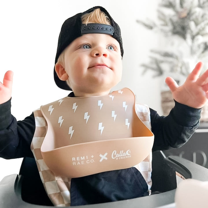 Our classic Catch All Bib gets a fun new makeover with the striking lightning bolt print from Remi & Rae Co. This limited edition collaboration combines functionality with style, offering you a bib that not only catches the mess but also looks rad doing it!