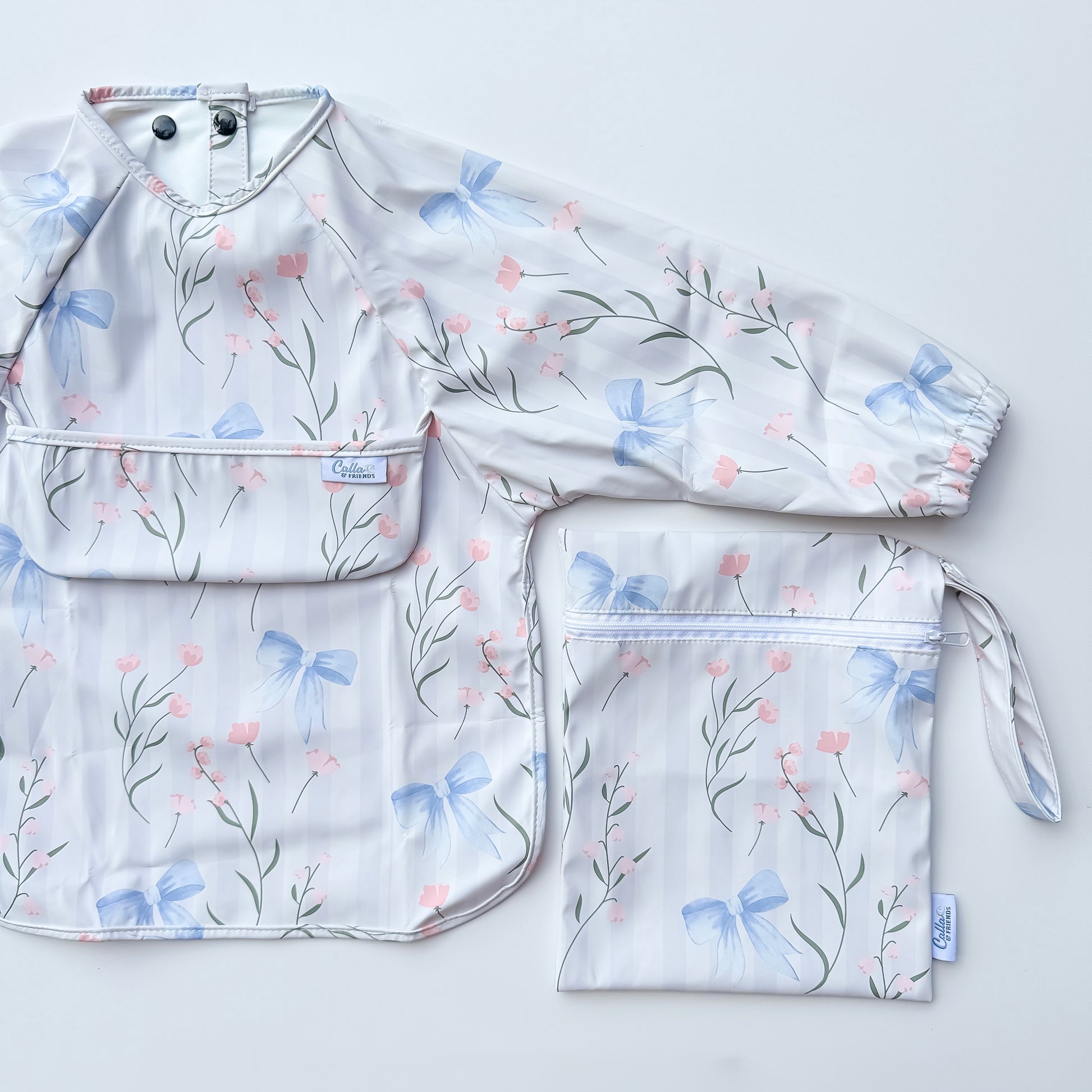 Perfect for your little one's meal-time, water table adventures, messy crafts, or any other time you want to keep those cute clothes clean. Not only do these long sleeve bibs match all of their cute clothes, they’re also highly functional. Each bib comes in a matching wet/dry bag making it perfect for on the go. Simply place your dirty bib back in its bag & keep your diaper bag clean. With their waterproof design and catch-all pocket, they effortlessly keep your baby's clothes clean and dry. The pocket even folds under to fold flat when not needed for crafts or sensory tables. The multi-snap neck closure & elastic cuffs ensure a secure and adjustable fit that grows with your little one, making them perfect for every stage of their development.