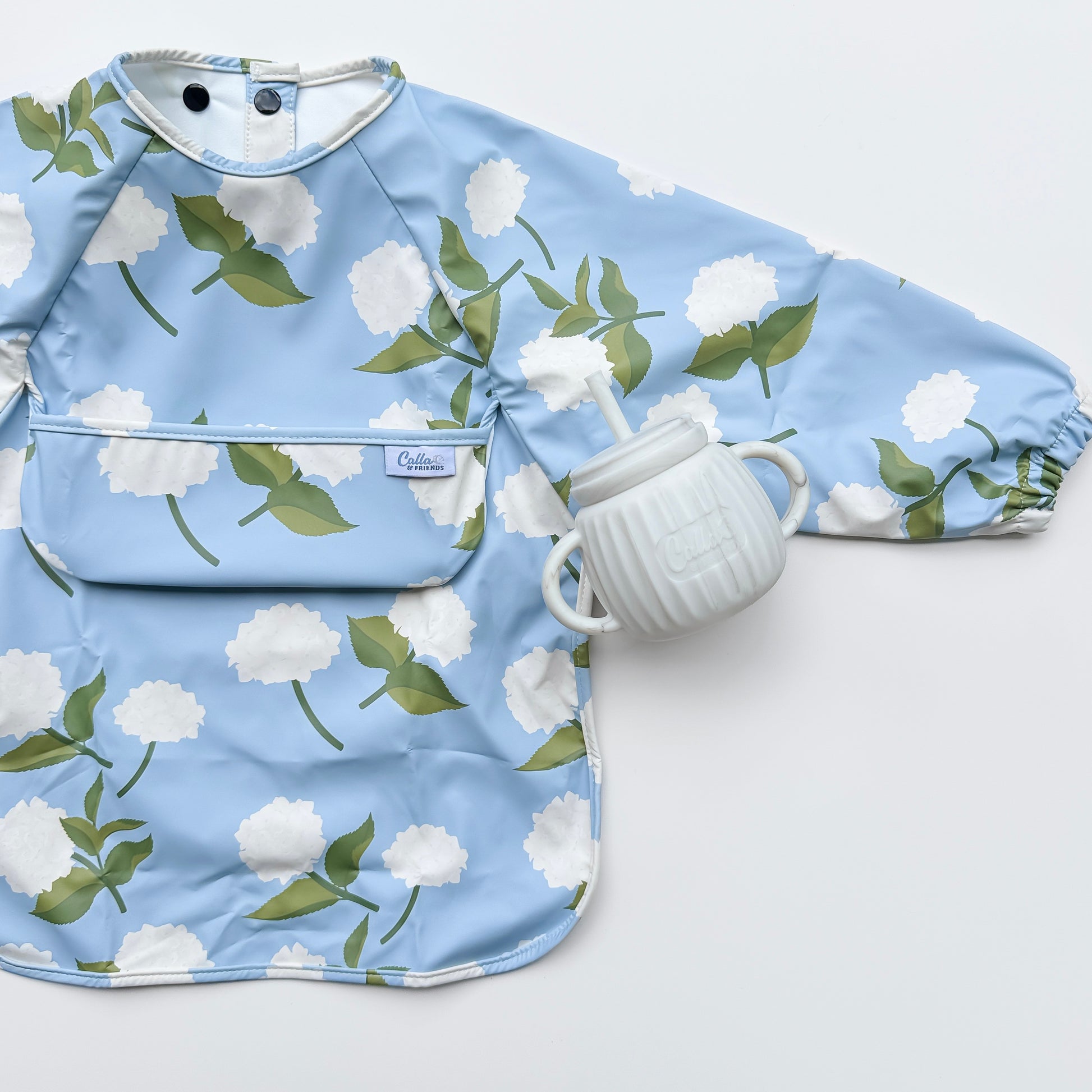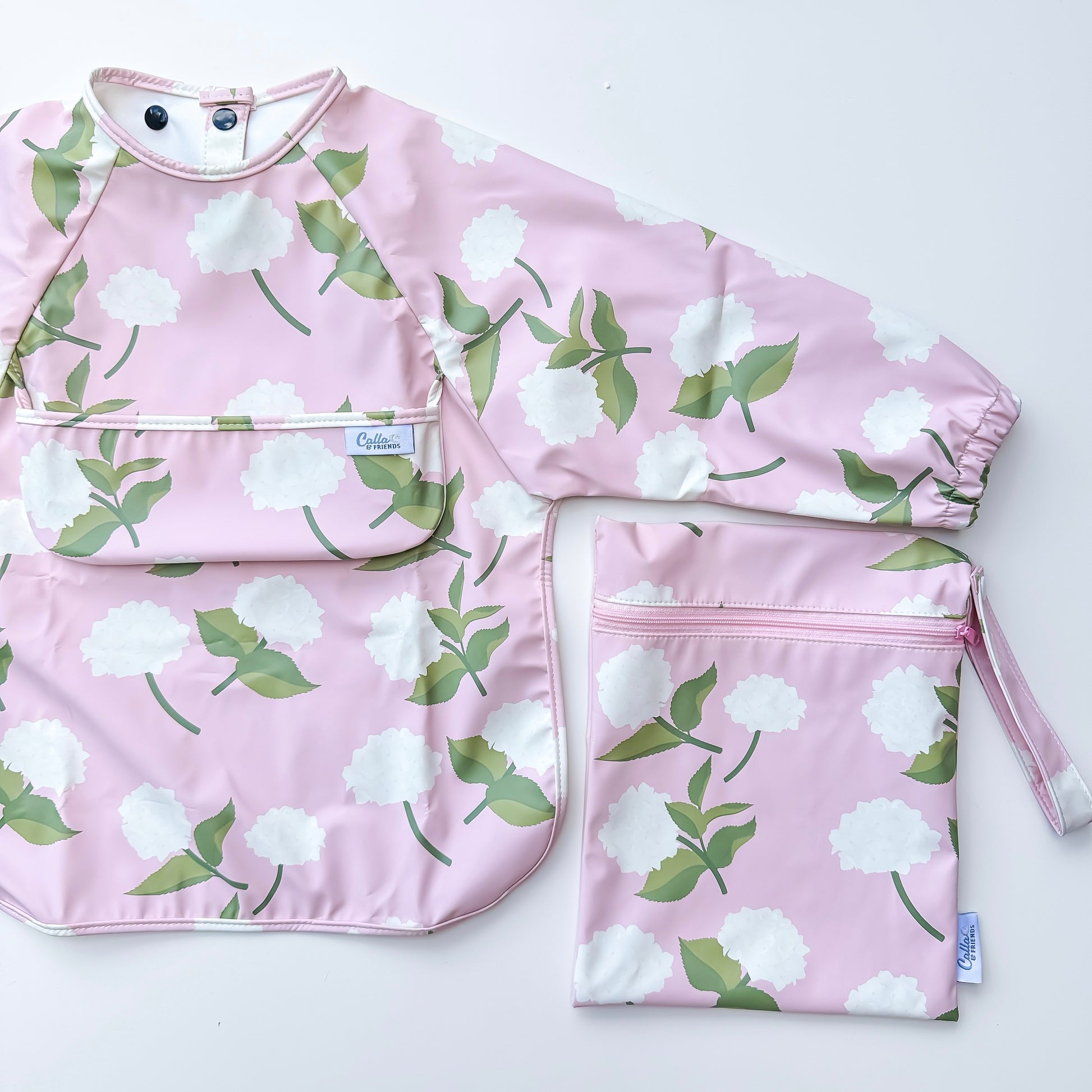Perfect for your little one's meal-time, water table adventures, messy crafts, or any other time you want to keep those cute clothes clean. Not only do these long sleeve bibs match all of their cute clothes, they’re also highly functional. Each bib comes in a matching wet/dry bag making it perfect for on the go. Simply place your dirty bib back in its bag & keep your diaper bag clean. With their waterproof design and catch-all pocket, they effortlessly keep your baby's clothes clean and dry. The pocket even folds under to fold flat when not needed for crafts or sensory tables. The multi-snap neck closure & elastic cuffs ensure a secure and adjustable fit that grows with your little one, making them perfect for every stage of their development.
